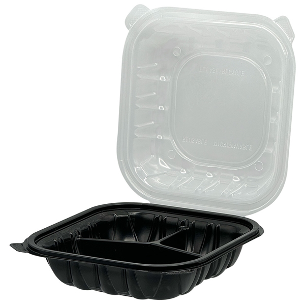 8x8 3 Compartment PP Hinged Container Black/Clear Lid, Vented, Empress, 180/cs