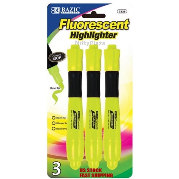 Bazic Fluorescent Highlighters Yellow Desk Style Chisel Tip w/ Cushion Grip (3/Pack) - Bright, vivid color provides maximum impact
