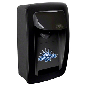 DECO custom dispenser with Performance Plus logo printed on front faceplate. Manual push pad. Black Top dispensing design - no leak Durable plastic, no metal parts Dispenses .75mL per activation ADA push compliant - secure lock